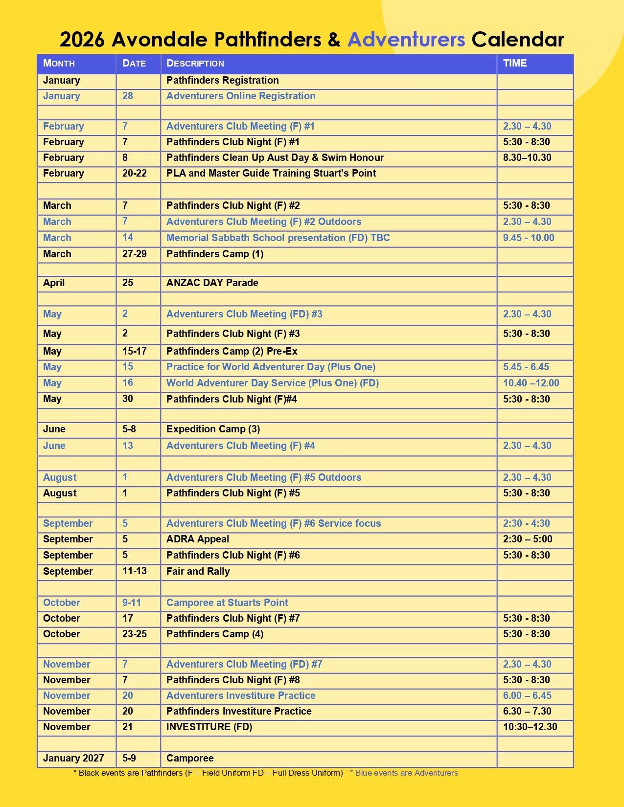 Avondale Pathfinders is a Christ-centered program for ages 10-16 (Grades 5-10), designed to inspire growth through adventure, faith and friendship. Within our club, young people find a sense of belonging, develop life skills and embrace challenges that build confidence, reslience and character. Our club meets 8 times a year for skill-building activities and honors, plus 4 weekend campouts, and service projects that make a difference locally. We welcome new families and volunteers who share our passion for developing resilient, compassionate leaders.